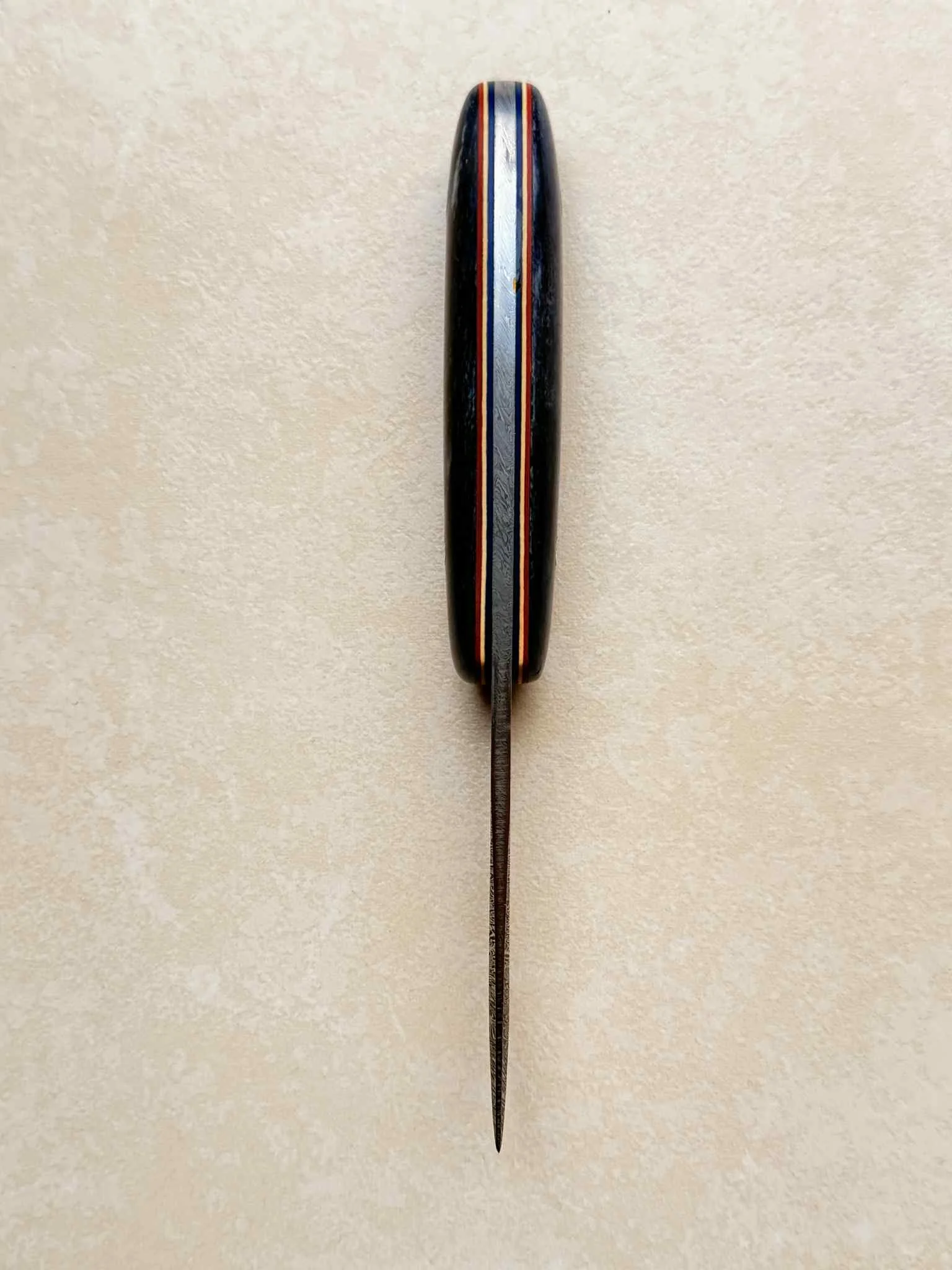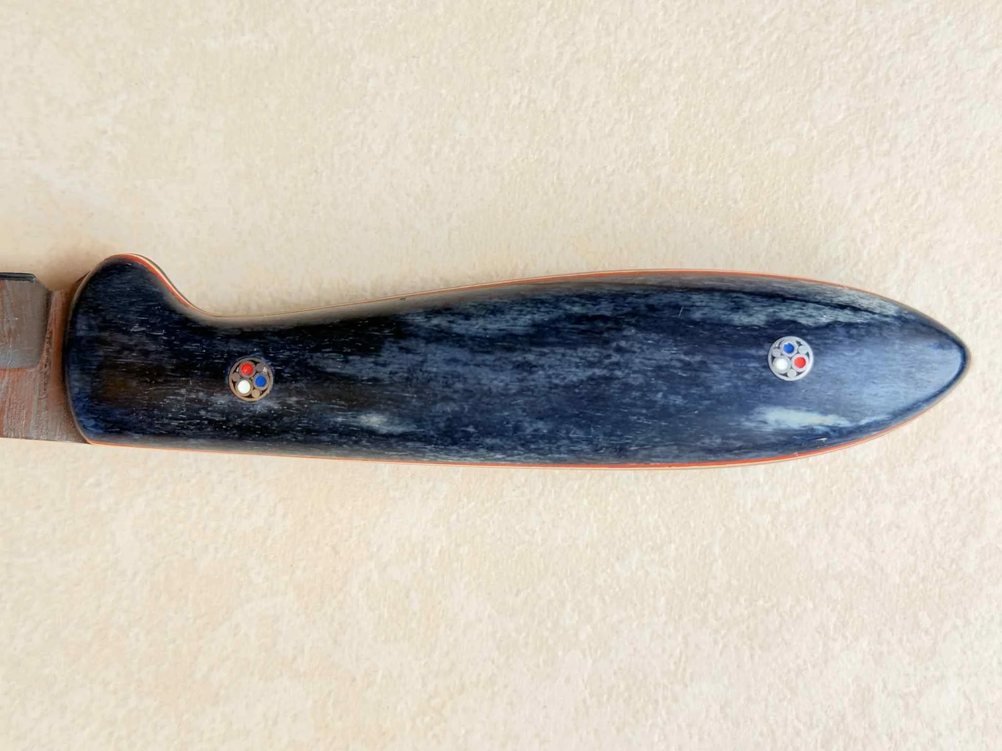 My second handmade knife. I ordered the damascus steel blade, and I made the handle with giraffe bone. French creation, with french touchs: blue, white and red!